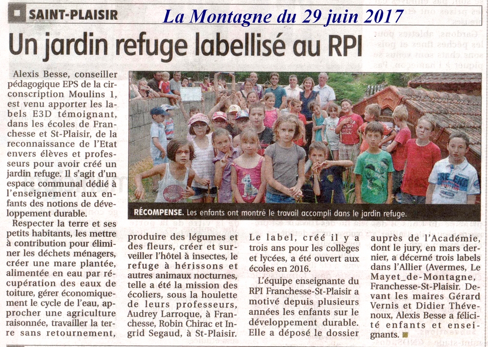 Un jardin refuse labellisé du RPI - La Montagne du 29 juin 2017