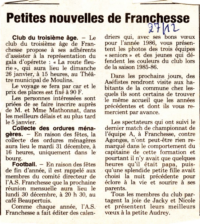 Petites nouvelles de Franchesse - La Montagne du 27 décembre 1985