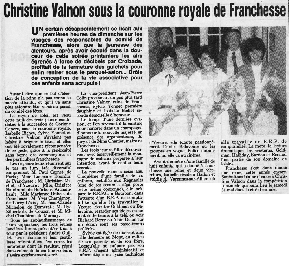 Christine Valnon sous le couronne royale de Franchesse - La Montagne en mai 1986