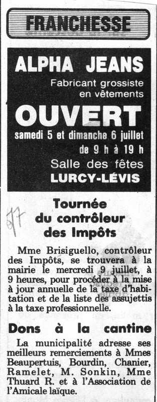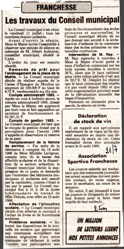 Tournée du contrôleur des impôts / Dons à la cantine - La Montagne de juillet 1986
