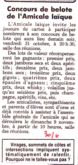 Concours de belote de l'Amicale Laïque - La Montagne du 30 octobre 1986