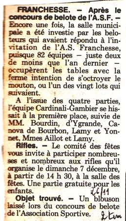 Après le concours de belote de l'A.S.F. / Rifles / Objets trouvés - La Montagne du 26 novembre 1986
