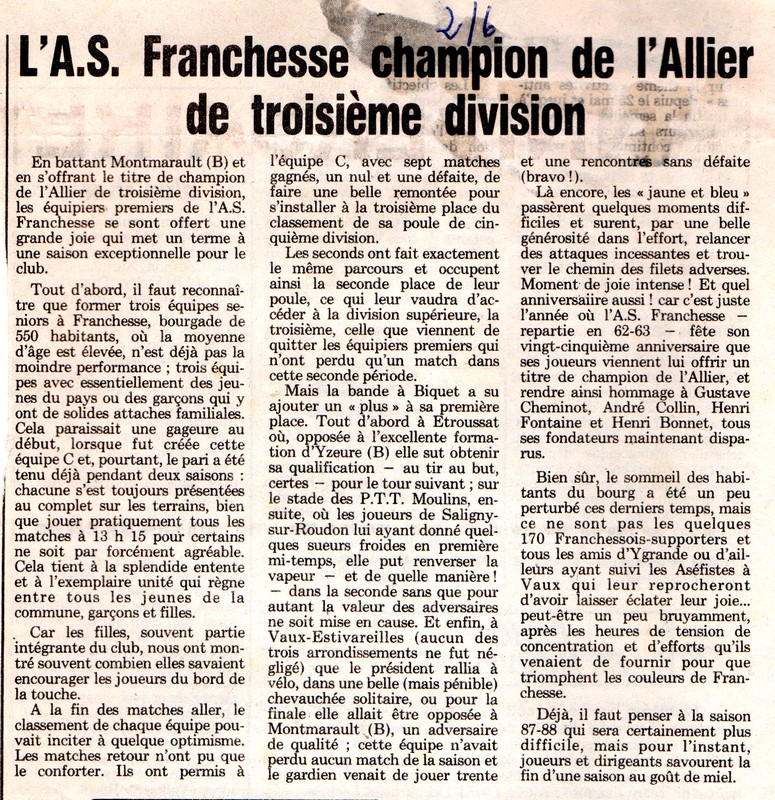 L'A.S. Franchesse champion de l'Allier de troisième division - La Montagne du 2 juin 1987