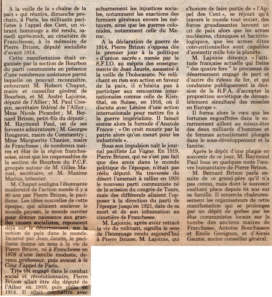 Vibrant hommage à Pierre Brizon - La Montagne du 10 juin 1987