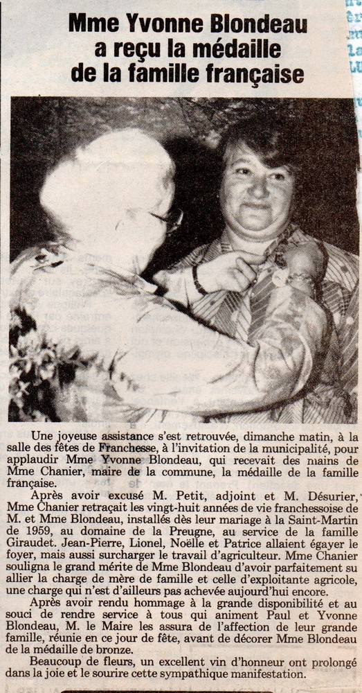 Mme Yvonne Blondeau a reçu la médaille de la famille Française - La Montagne du 17 juillet 1987