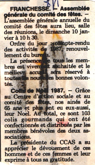 Assemblée générale du comité des fêtes / Colis de Noël 1987 - La Montagne du 8 janvier 1988