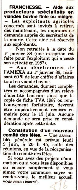 Agriculture / Comité des fêtes - La Montagne du 8 juin 1988