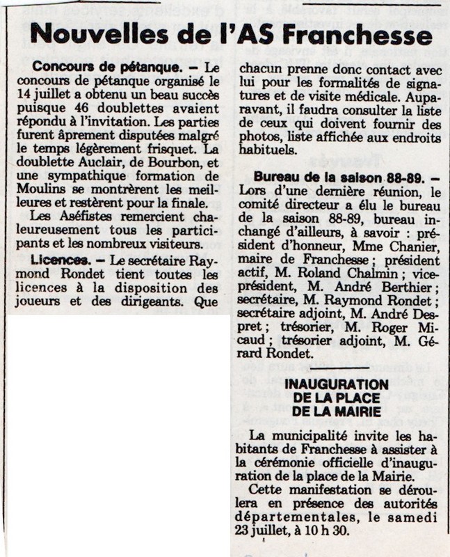 Nouvelles de l'A.S. Franchesse / Inauguration - La Montagne du 22 juillet 1988