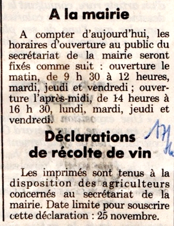 A la mairie / Déclaration de récolte de vin - La Montagne du 17 octobre 1988