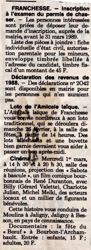 Permis de chasse / Déclaration de revenus / Amicale laïque / Cinémas La Montagne du 24 février 1989