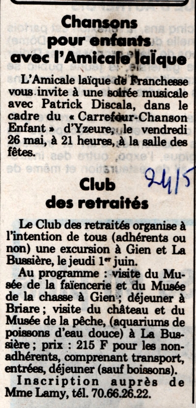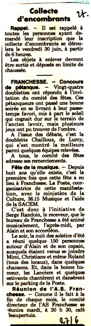 Collecte d'encombrants / Concours de pétanque / Fête de la musique / A.S. Franchesse - La Montagne du 27 juin 1989