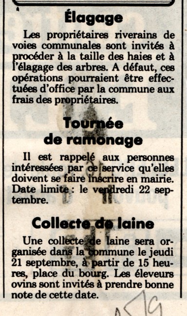 Elagage / Tournée de ramonage / Collecte de laine - La Montagne du 15 septembre 1989
