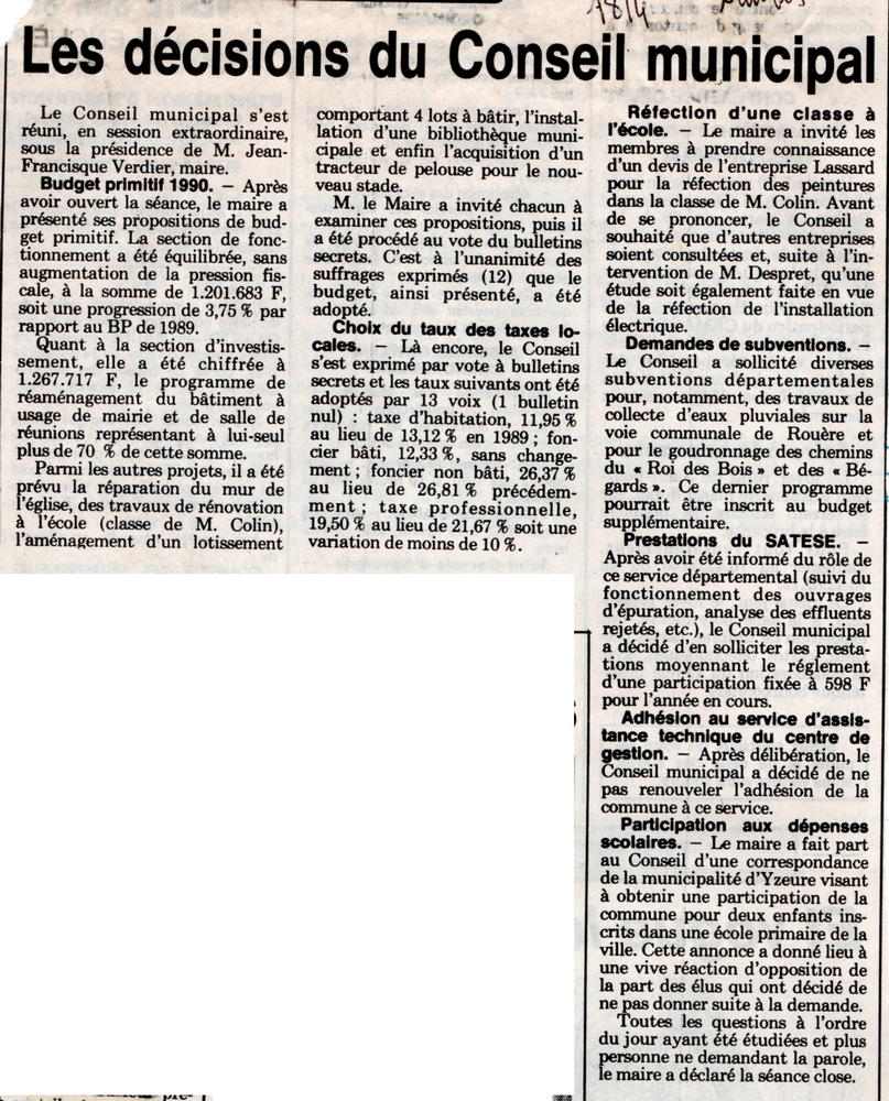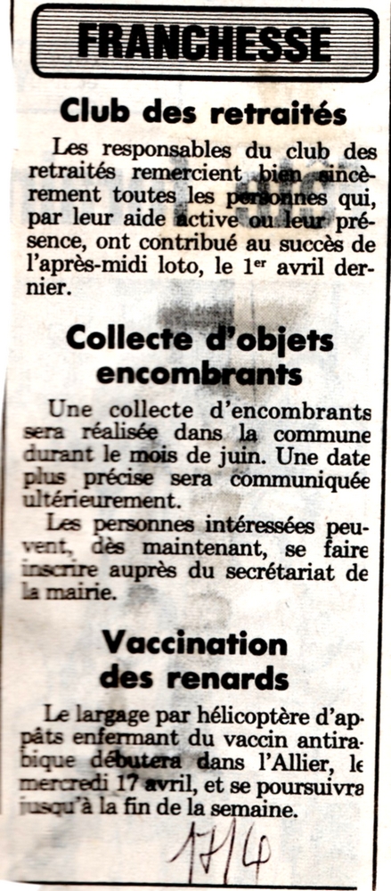 Les décisions du Conseil municipal / Club des retraités / Collecte d'objets / Vaccination des renards - La Montagne du 18 avril 1990