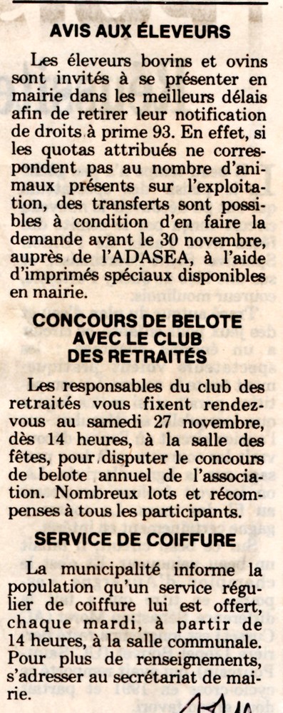 Avis aux éleveurs / Concours de belote avec le club des retraités / Service de coiffure - La Montagne du 18 novembre 1993