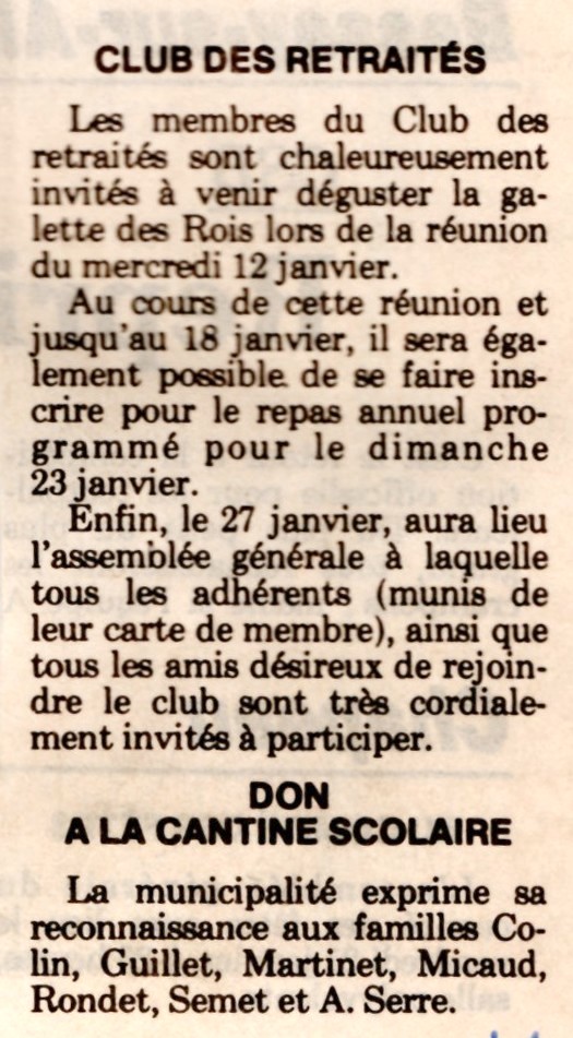 Club des retraités / Dons à la cantine scolaire - La Montagne du 26 janvier 1994