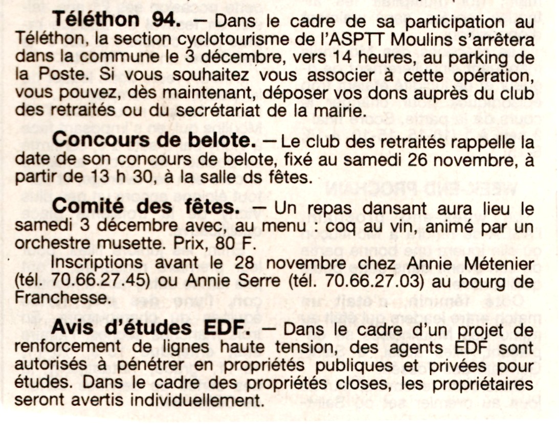Téléthon / Concours de belote / Comité des fêtes / Etudes EDF - La Montagne du 24 novembre 1994