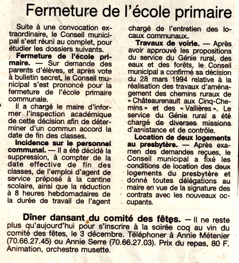 Fermeture de l'école primaire / Comité des fêtes - La Montagne du 28 novembre 1994