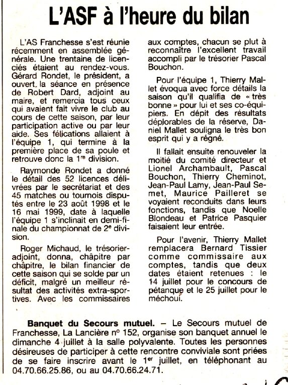 L'A.S.F. à l'heure du bilan / Banquet du Secours mutuel - La Montagne du 21 juin 1999